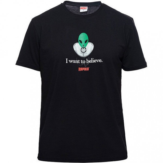 Чёрная футболка Rapala с приманкой на тему пришельцев и слоганом «Хочу верить» спереди. Изготовлена из хлопка.